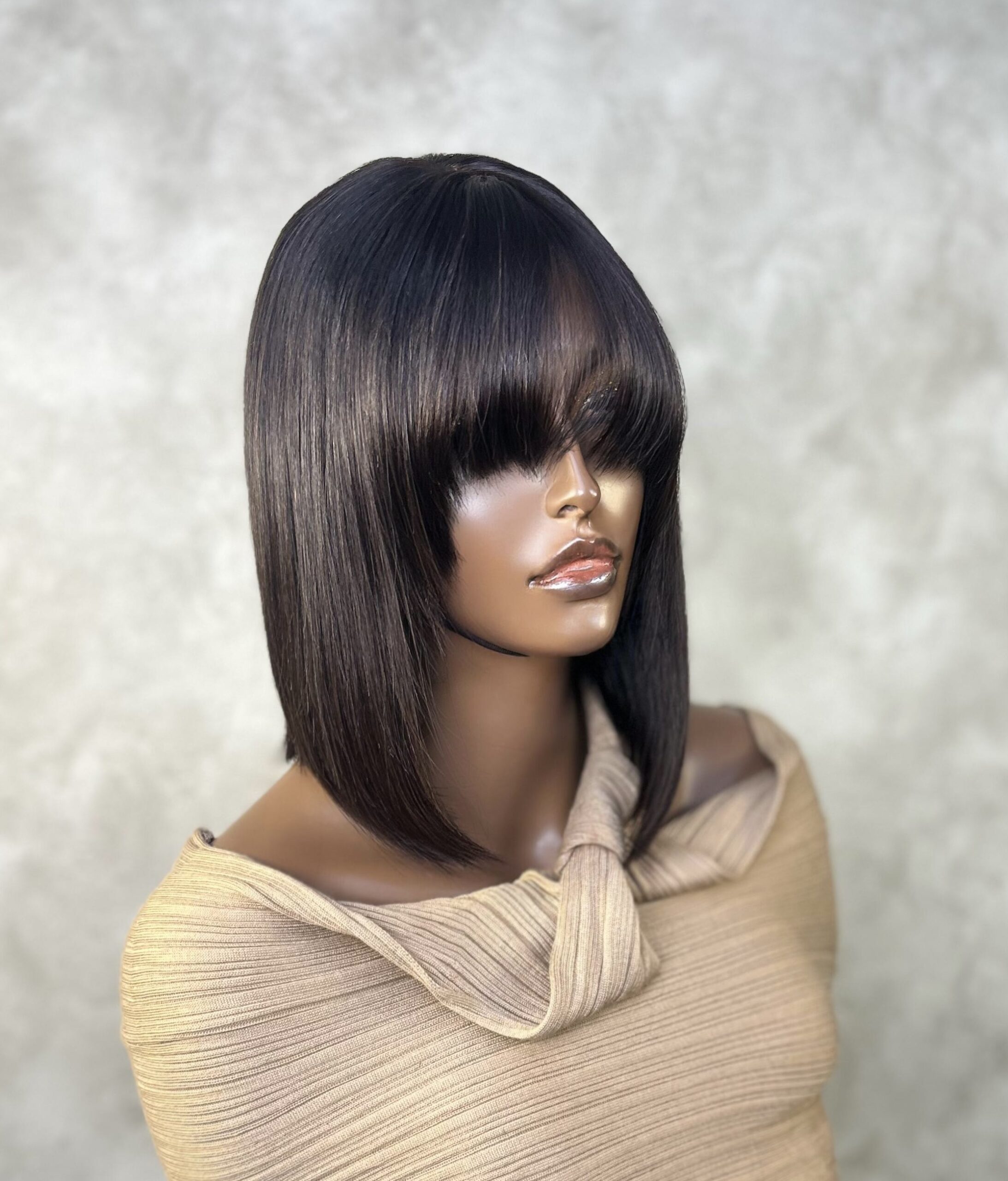 The straight double-drawn bob fringe wig is a bone straight wig available in 12 inches and is processed to ensure uniform thickness and volume from the roots to the tips. The uniform length of hair strands gives a natural, dense look. The straight double-drawn bob fringe wig is a bone straight wig is desirable for those seeking a luxurious, thick-haired appearance.